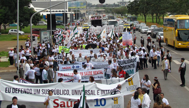 Um ato, seguido por caminhada, promovido pelo Movimento Saúde + 10, mobilizou milhares de pessoas, na Esplanada dos Ministérios, em Brasília, na manhã da última quarta-feira (10), em defesa de mais investimentos na saúde pública brasileira.